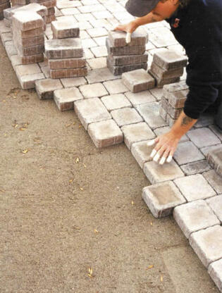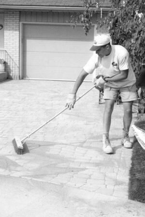 | The contractor reinstalls concrete pavers in an area where bedding sand was lost due to heavy rainfall. |
