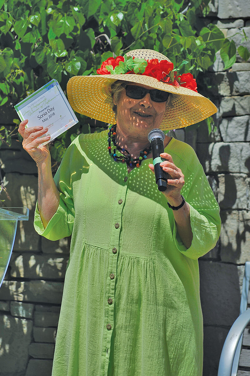 The Monica van Maris Women of Influence Award was presented to Sonia Day at the Toronto Botanical Garden’s Blossom Party, May 29, 2018. In true Sonia fashion, Day accepted the honour with a light-hearted, witty speech reminiscent of her Toronto Star column and published works.