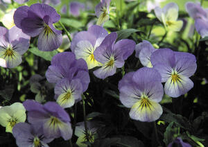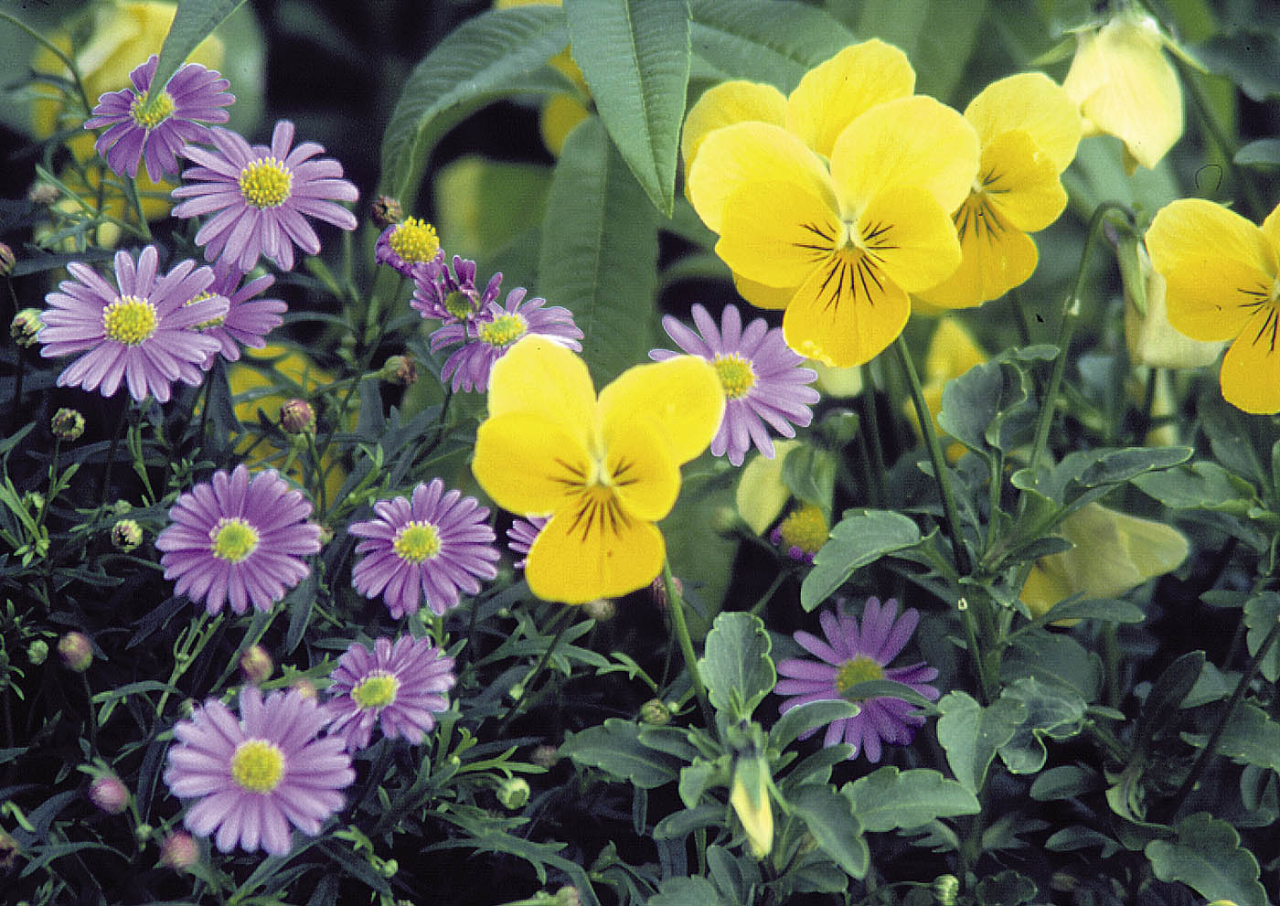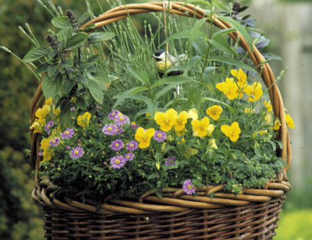 | Brachysome segmentosa ‘Mauve Delight’ with its tiny mauve, daisy-like flowers and lemon-yellow centres, and Viola cortuna ‘Princess Yellow’, with yellow blooms and delicate maroon whiskers add colour and appeal to scented baskets. |