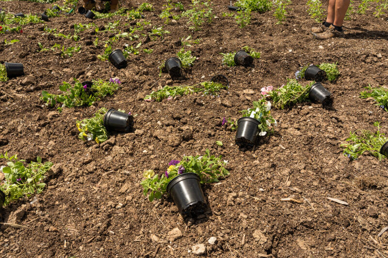 Plants grown in 4-inch pots have been spaced out in staggered rows to plan out placement.