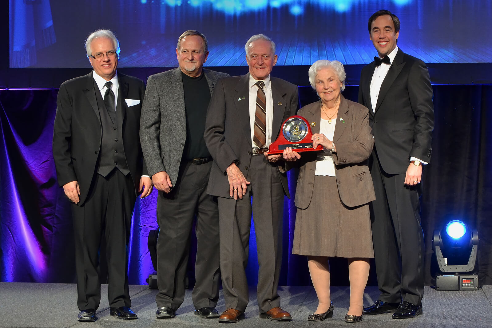 Margaret and Ivan Stinson accept Landscape Ontario’s Legacy Award in 2015. The award recognizes a lifetime of achievement in the horticulture industry. (L-R): Tony DiGiovanni, Phil Dickie, Ivan Stinson, Margaret Stinson, Dave Braun.