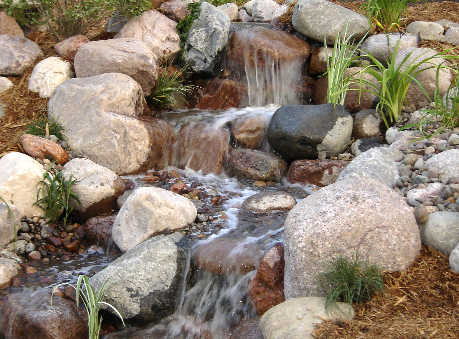 A pond, two feet in depth, is ideal for zone 6. In zone 5 or less, dig a three-foot hole around a waterfall for increased winter protection for any fish you may wish to include in the pond. Make shelves to support edge rocks only, or for pre-determined edge planting. Sides should be steep (10 to 20 degree angle). Level the edges. Water seeks its own level. Clean excavation of stone and other projectiles. Line bottom with three inches of sand and ‘damp pat’ the hole in the sides. Lay a fabric liner cloth over the bottom and sides. Lay pre-cut P.V.C. or EPDM liner loosely into the hole. (Calculate liner size by measuring the maximum length and width, adding twice the maximum depth and at least two feet for edges). Fill with water and tuck the folds as the excavation fills. Edge with stones or plants and trim excess material.
