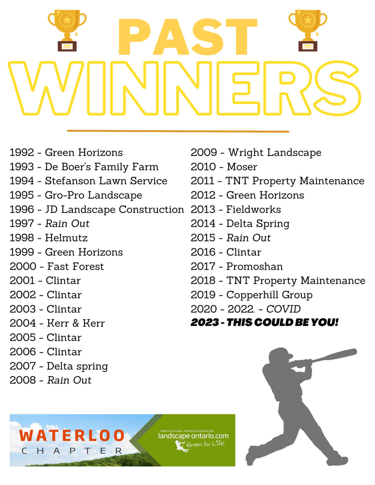 Dreaming of warmer weather? So are we! Back by popular demand, Waterloo Chapter is hosting its annual baseball tournament and family picnic social at the newly renovated Upper Canada Park.