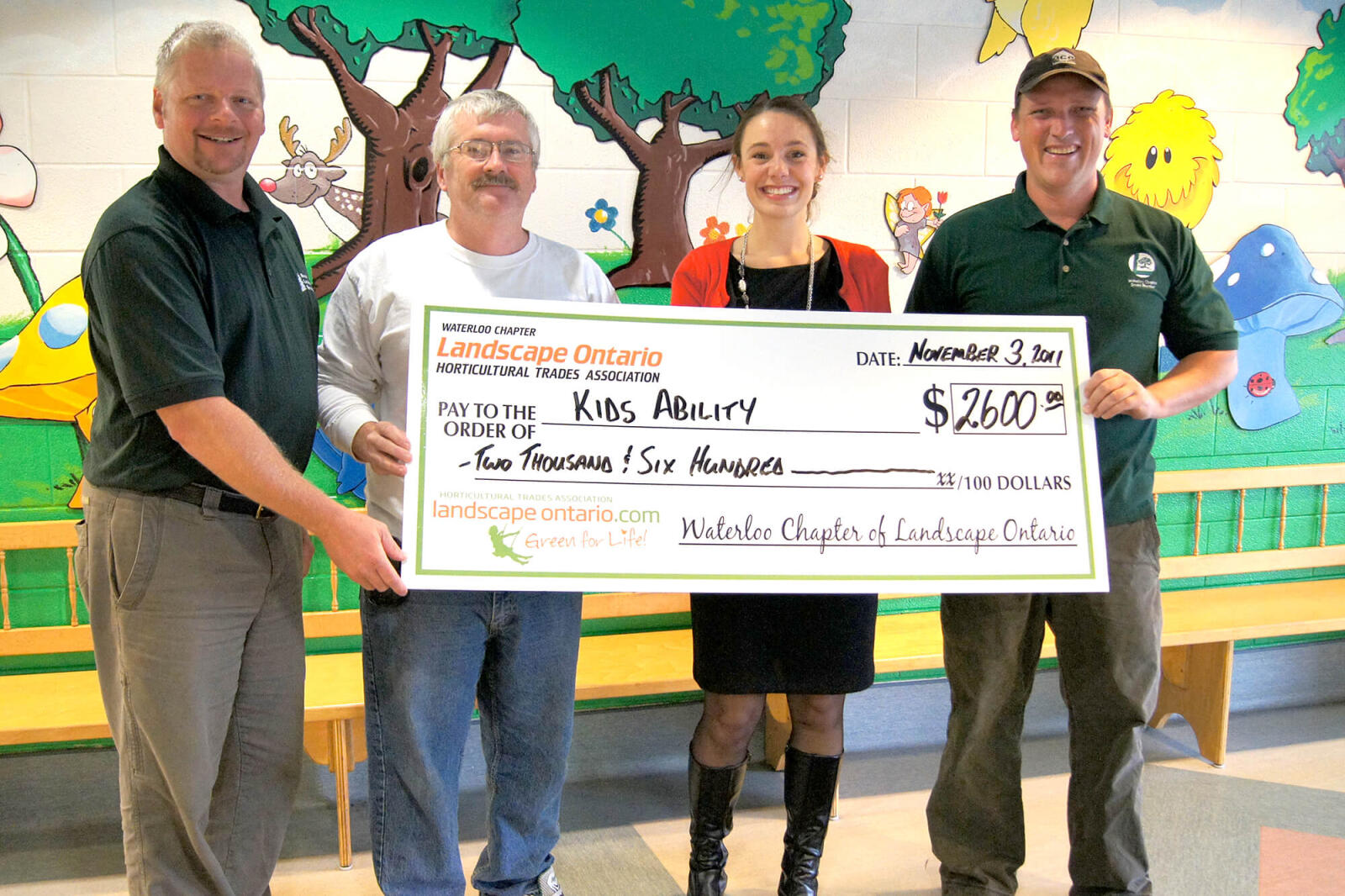 The Waterloo Chapter had a very successful golf tournament this past summer, and from that event, it was able to share proceeds with a number of charities. One such charity is KidsAbility, which received $2,600 from the Chapter. In photo, from left, Richard Burch, Chapter director, Rob Tester, Chapter president, Gillian Flanagan, development officer KidsAbility, and Jason Dietrich, chair of Waterloo Golf Committee. The Chapter will also provide funds to its education fund and school greening project.